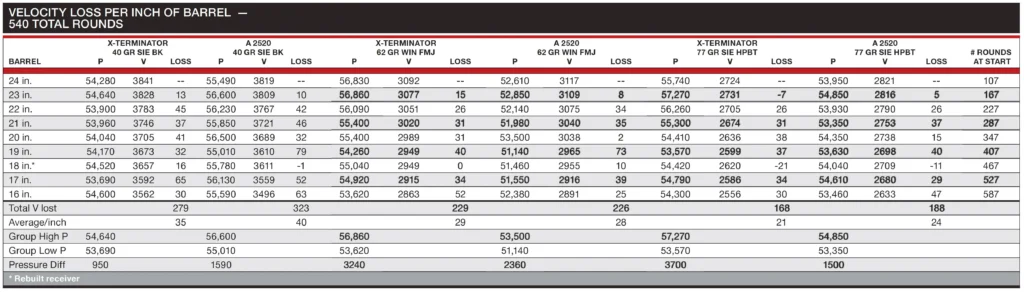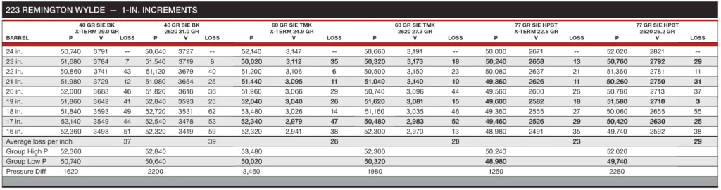 While the results of these tests aren’t totally linear, using the average velocity drop for the entire test will get you close to the velocity difference you would expect for a barrel that is shorter or longer than the test barrel used in a ballistic lab. The 6.5 Creedmoor velocity drop averaged 25 fps per inch. The results of the two 223 Wylde tests were very similar, with the light 40-grain bullets averaging about 38 fps per inch, while the heavy 77-grain bullets saw an average close to 25 fps per inch. It would make sense that the heavy compressed loads used with the light bullets would show more velocity difference than the loads used with the 77-grain bullet that did not fill the case.