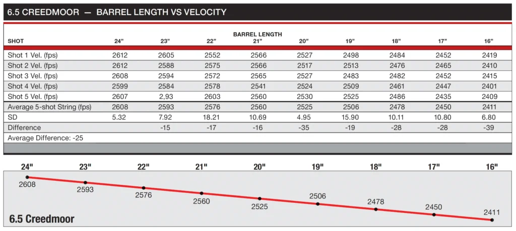 The Hodgdon Ballistics Lab measured velocities in 6.5 Creedmoor and 223 Wylde rifle barrels and in 9mm Luger and 45 ACP pistols, reducing the barrel lengths one inch at a time to derive an average velocity difference per inch of barrel.