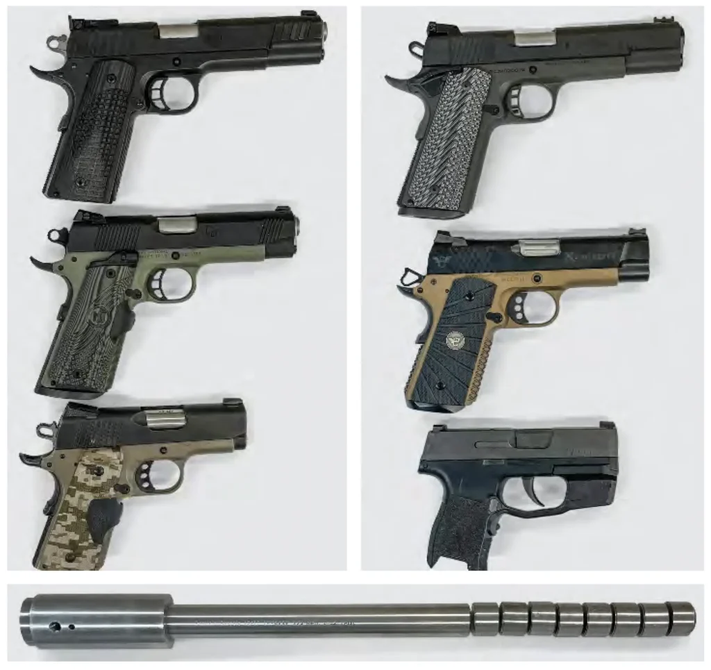 In the handgun test, we fired 9mm Luger and 45 ACP pistols with barrel lengths of 3, 4, and 5 inches for both calibers. The 9mm Luger load was a factory 90-grain +P self-defense load, and the .45 ACP load was factory 230-grain ball ammunition.