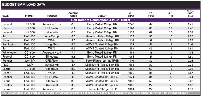 I used a vintage Colt Series 70 Combat Commander Model 1911 to shoot the handloads listed here. And I assembled all of the loads on an RCBS Rock Chucker Supreme single-stage press, using Lee Precision 9mm Luger dies.