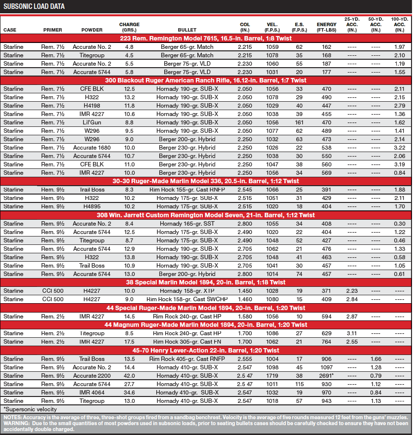 At the short distances slow-poke loads are usually shot, load density does not appear to be a determining factor in producing the best accuracy. Load density for 8.7 grains of Titegroup behind the Hornady 175-grain SUB-X in the 308 Win. is only 26 percent, yet when that load was shot in my Jarrett custom rifle, it averaged 0.46 inch at 100 yards. That rifle, by the way, has a Remington Model Seven action, McMillan stock, and a medium-heavy Shilen Select Match Grade barrel. It consistently shoots inside half MOA with a variety of full-power loads, and I have used it to take a lot of game. Due to the small charges of powders used in subsonic loads, a short section of wooden dowel should be used to check each case for an accidental double charge prior to bulletseating.