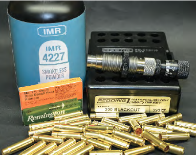 It should be noted that powder charges shown by Hodgdon under the “Maximum Loads” heading indicate the heaviest charge that could be used in the company’s pressure gun without exceeding subsonic velocities. It does not indicate a maximum-pressure charge. This becomes quite clear when comparing maximum pressures shown for full-power loads in the 300 Blackout and those listed for subsonic loads in that cartridge. Due to the absolute minimum chamber and bore dimensions of a pressure barrel, pressure and velocity of a particular powder charge/bullet weight combination can be higher than in many offthe-shelf, mass-produced rifles. A velocity ranging from 1,000 fps to 1,075 fps is the goal, and in order to reach that, the subsonic charge listed by Hodgdon may have to be increased slightly when loading for the typical factory rifle. On the other hand, some rifles may require a slight decrease in Hodgdon’s recommended charge weight.