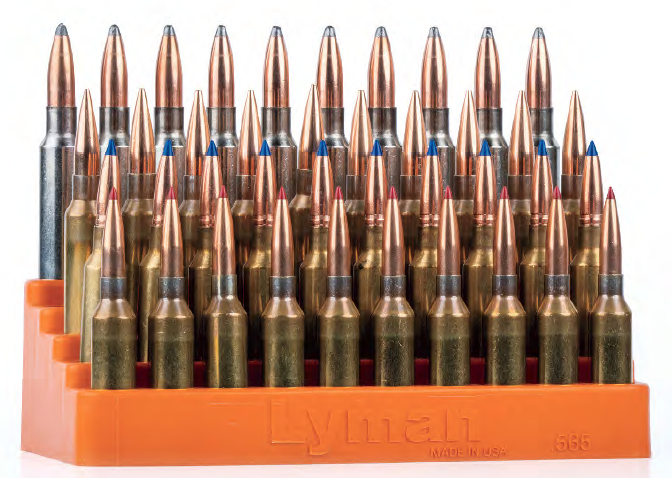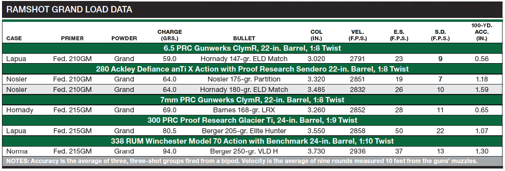 In the 6.5 PRC test batch of handloads, I loaded Hornady 147-grain ELD Match bullets over 59.0 grains of Grand, using new Lapua cases primed with Federal 210 Gold Medal primers. Bullets were seated to just kiss the rifling, resulting in an overall length of 3.020 inches. I assembled two different test batches for my 280 Ackley, one consisting of Nosler 175-grain Partition bullets, the other of Hornady 180-grain ELD Match bullets. Both were seated over 64.0 grains of Grand, in Nosler cases primed with Federal 210 Gold Medal primers. Both projectiles were seated to lightly contact the rifling. Overall length with the Partition bullets was 3.320 inches; with the ELD Match bullets it was 3.485 inches. For the 7mm PRC, I handloaded Barnes 168-grain LRX bullets over 69.0 grains of Grand, using once-fired Hornady cases primed with Federal 215 Gold Medal primers. As the LRX is a very dense, monometal design, I seated the bullets 50 thousandths off the rifling. Overall length was 3.260 inches. My test loads for the 300 PRC consisted of Berger 205-grain Elite Hunter bullets over 80.0 grains of Grand powder. I seated them in new Lapua cases primed with Federal 215 Gold Medal primers, to an overall length of 3.550 inches. The throat on the Proof Research Glacier Ti rifle used for testing is deep, and the Berger bullets had to jump a couple of tenths of an inch before engaging the rifling leade.