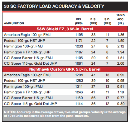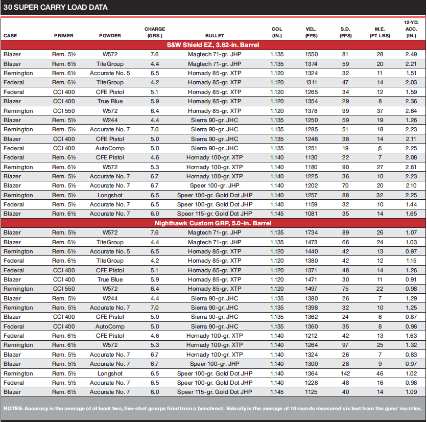 After purchasing the Shield EZ and firing many rounds, I became a supporter of the 30 Super Carry cartridge. So much so that I bought the Nighthawk Custom GRP. Both are excellent handguns.